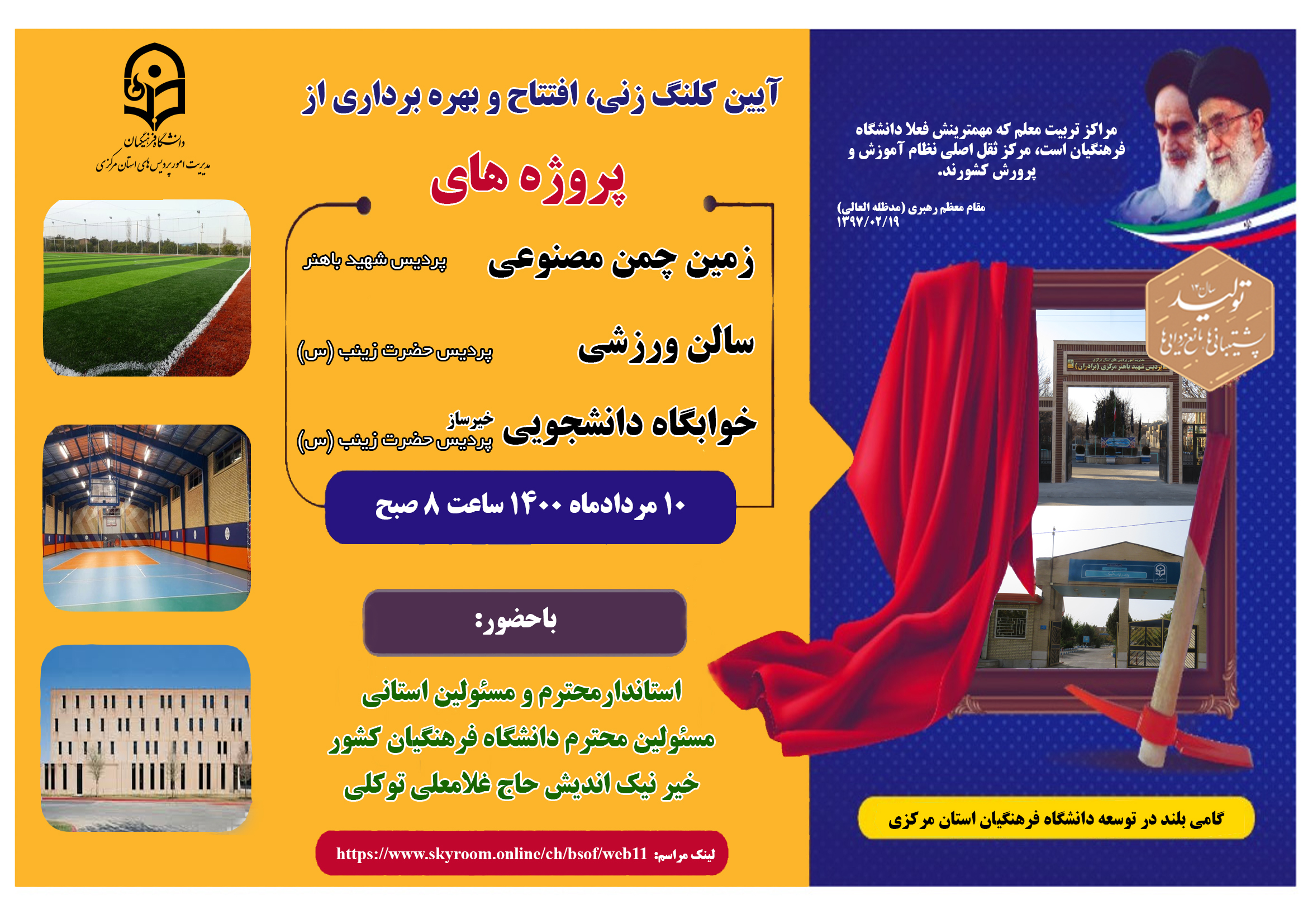 ضمن تبریک عید سعید غدیرخم، به استحضار می رساند با استعانت از خداوند متعال همزمان با اجرای اختتامیه جشنواره کشوری طنز ورزشی، پروژه های زیر در پردیس های استان مرکزی با حضور مسئولان استان و سازمان مرکزی دانشگاه فرهنگیان و همچنین خیّر نیک اندیش جناب آقای غلامعلی توکلی اجرا خواهند شد.
