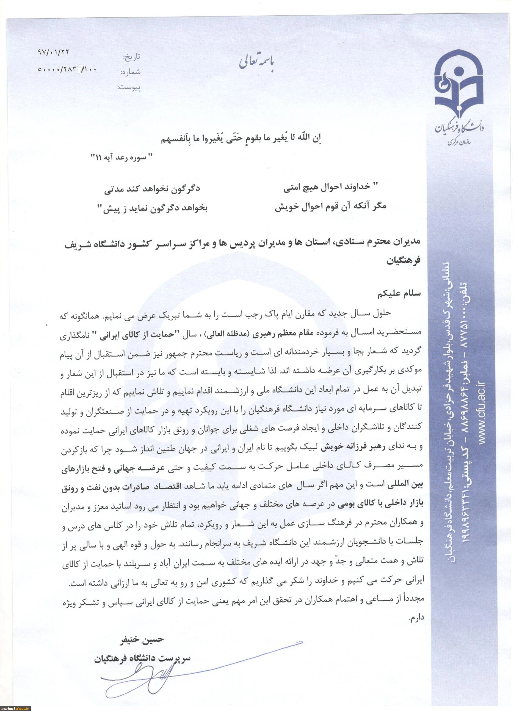 دکتر خنیفر در نامه ای خطاب به مدیران دانشگاه فرهنگیان تاکید کرد: