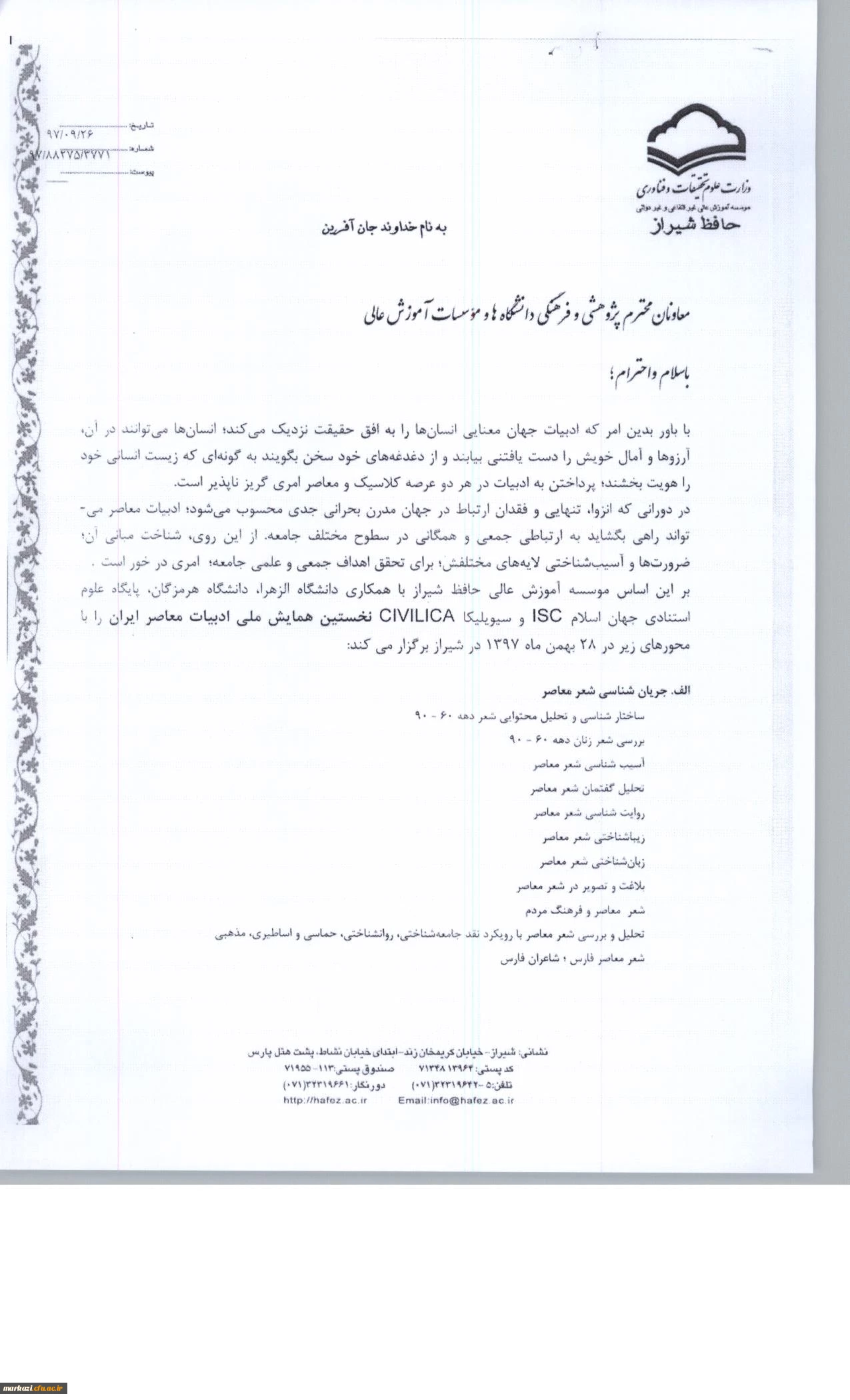 قابل توجه اعضای محترم هیئت علمی فراخوان شرکت در همایش ملی ادبیات معاصر 2
