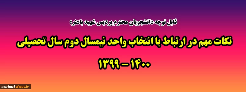 امتیاز دهید : نکات مهم در ارتباط با انتخاب واحد نیمسال دوم سال تحصیلی 1400 - 1399 2 شنبه 11 بهمن 1399 ساعت 8:04