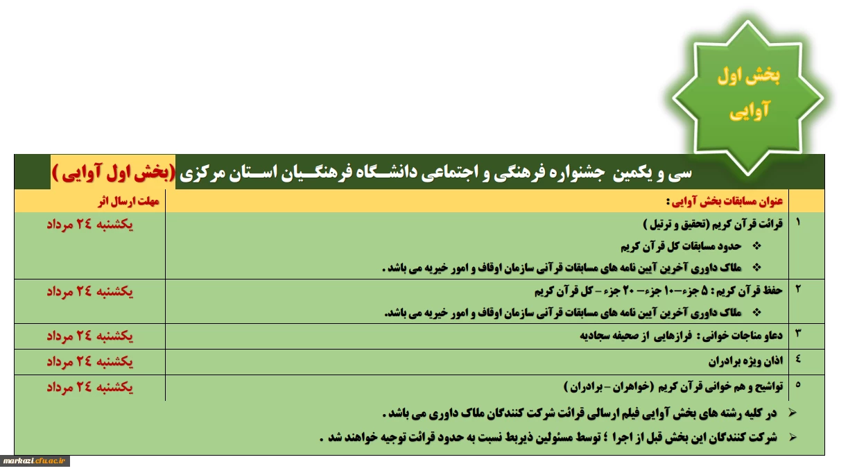 امتیاز دهید : جدول زمانبندی برگزاری بخشهای دهگانه مسابقات قرآن و عترت دانشگاه فرهنگیان 2 شنبه 9 مرداد 1400 ساعت 9:42