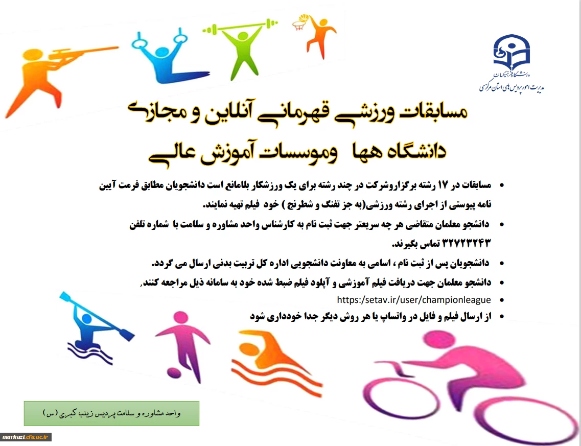امتیاز دهید : مسابقات ورزشی قهرمانی آنلاین و مجازی دانشگاه ههاوموسسات آموزش عالی 2 چهارشنبه 13 مرداد 1400 ساعت 13:33