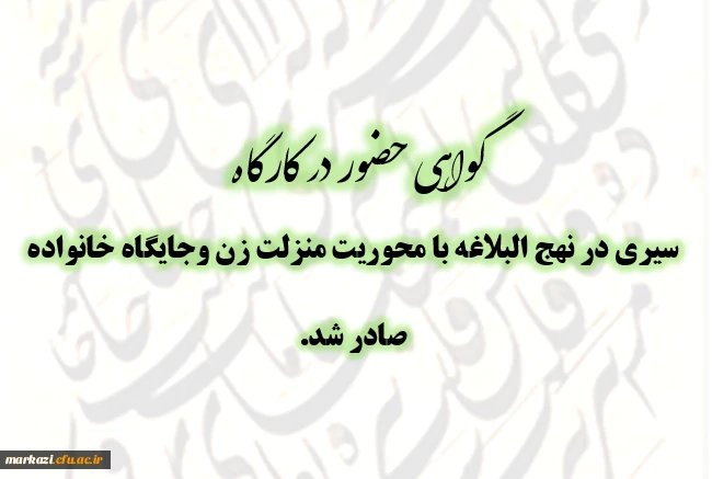 گواهی حضور در کارگاه آموزشی-تخصصی سیری در نهج البلاغه با محوریت منزلت زن وجایگاه خانواده صادر شد. 2