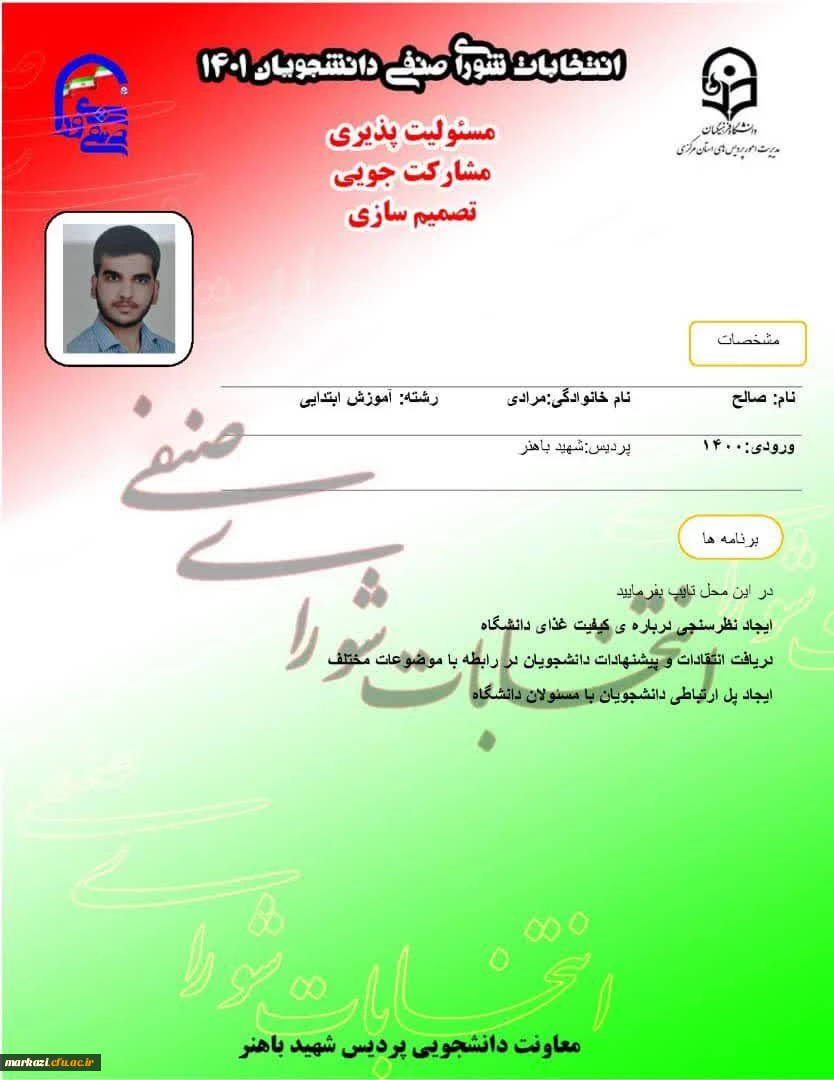 امتیاز دهید : پوستر تبلیغاتی کاندیداهای شورای صنفی پردیس شهید باهنر چهارشنبه 28 اردیبهشت 1401 ساعت 15:43