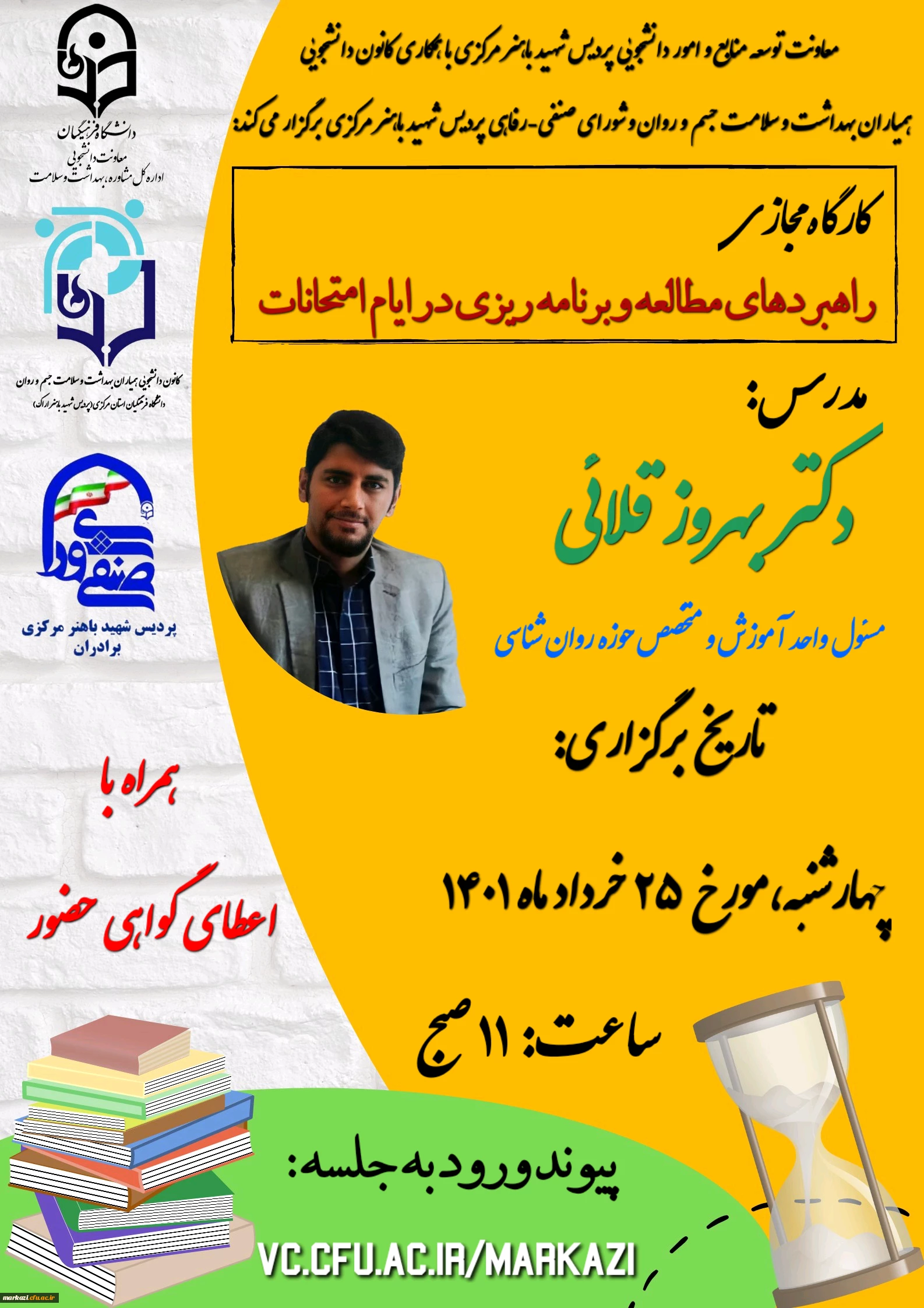 امتیاز دهید : کارگاه مجازی "راهبردهای مطالعه و برنامه ریزی در ایام امتحانات" 2 دوشنبه 23 خرداد 1401 ساعت 13:07