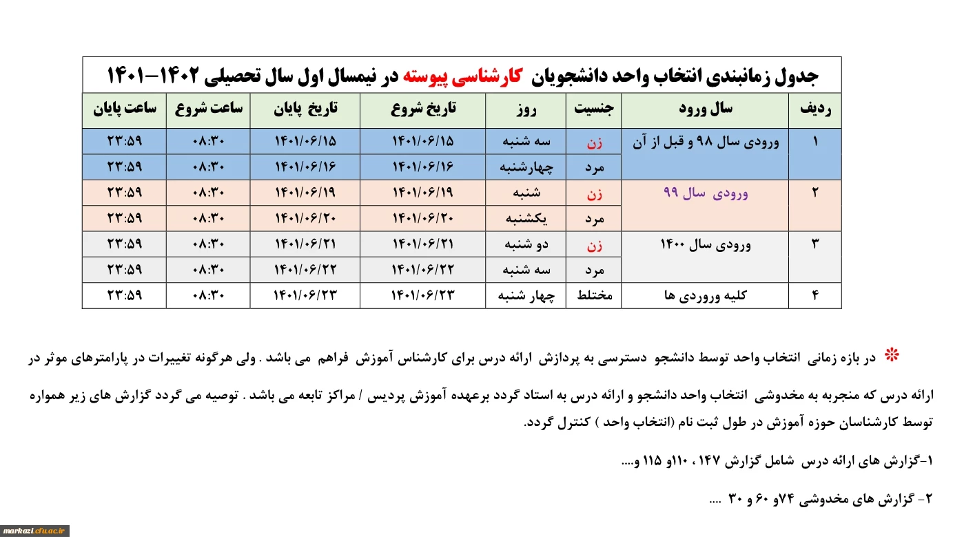 امتیاز دهید : جدول زمانبندی انتخاب واحد دانشجویان در نیمسال اول سال تحصیلی 1401 دوشنبه 14 شهریور 1401 ساعت 21:49