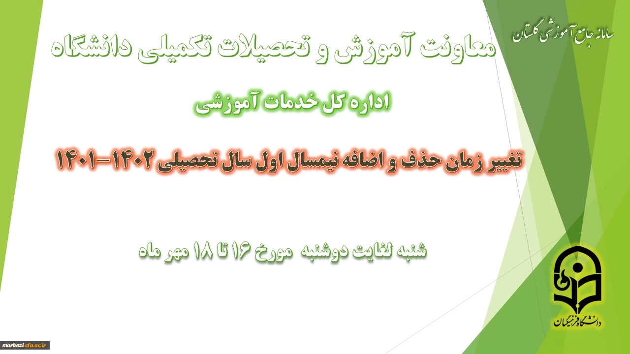 امتیاز دهید : تغییر بازه زمانی حذف و اضافه در نیمسال اول سال تحصیلی 1402-1401 2 یکشنبه 10 مهر 1401 ساعت 13:54