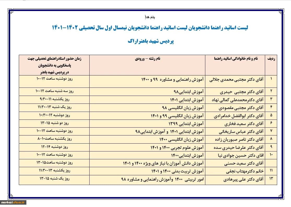 لیست اساتید راهنما دانشجویان نیمسال اول سال تحصیلی 1402-1401 پردیس شهید باهنراراک