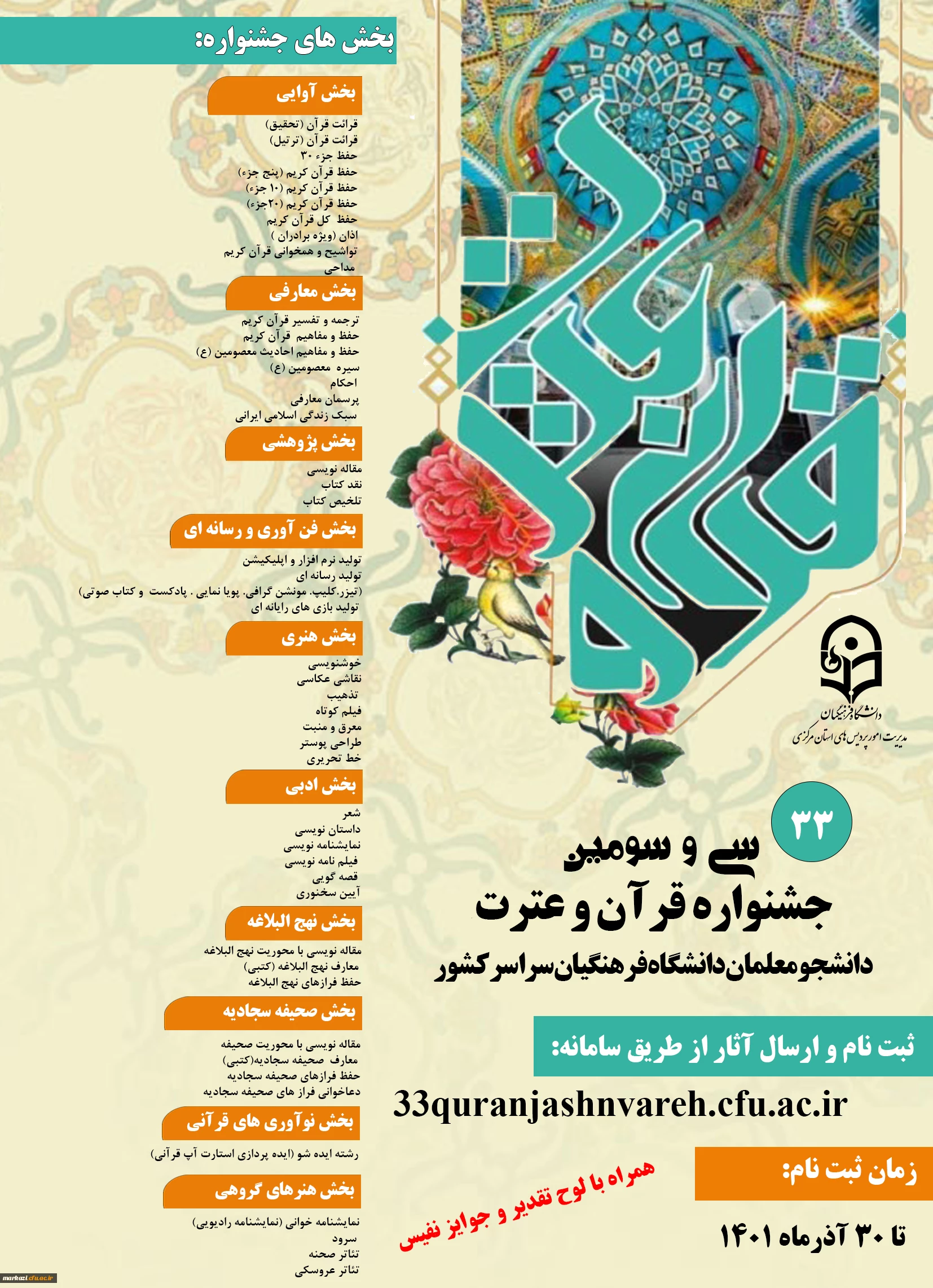 امتیاز دهید : سی و سومین جشنواره قرآن وعترت دانشجومعلمان دانشگاه فرهنگیان سراسر کشور 2 چهارشنبه 16 آذر 1401 ساعت 9:40
