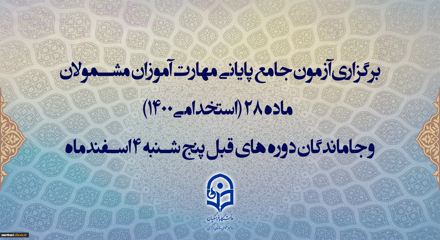 برگزاری آزمون جامع پایانی مهارت آموزان مشمولان ماده 28 (استخدامی1400) و جاماندگان دوره های قبل پنج شنبه 4 اسفندماه 2