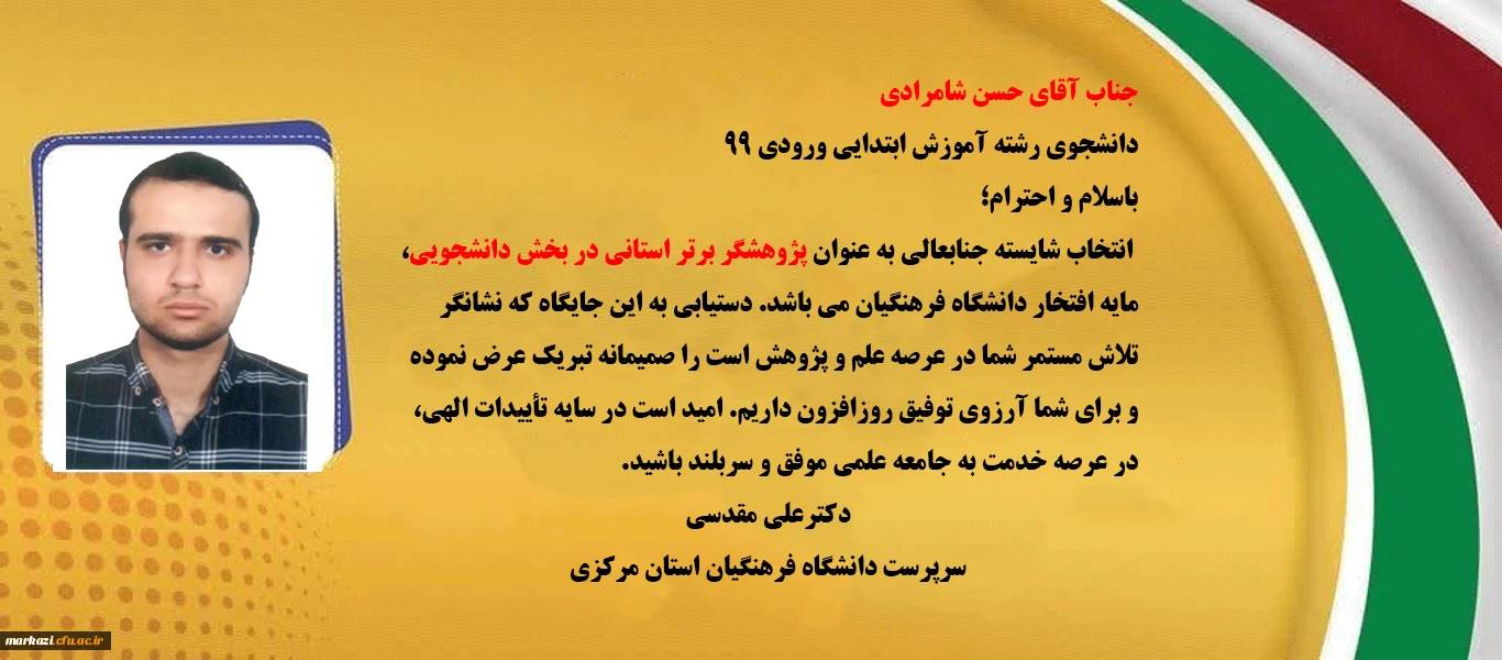 امتیاز دهید : پیام تبریک رئیس دانشگاه به حسن شامرادی به عنوان پژوهشگر برتر دانشجویی 2 سهشنبه 7 آذر 1402 ساعت 12:29