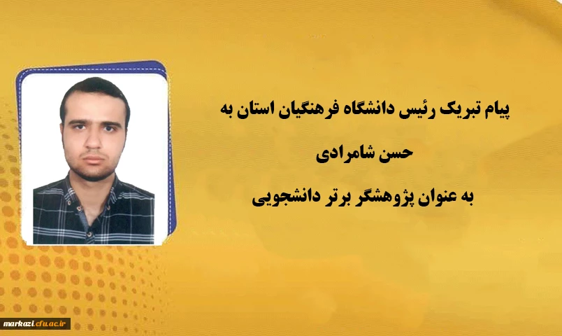 امتیاز دهید : پیام تبریک رئیس دانشگاه به حسن شامرادی به عنوان پژوهشگر برتر دانشجویی 2 سهشنبه 7 آذر 1402 ساعت 12:29