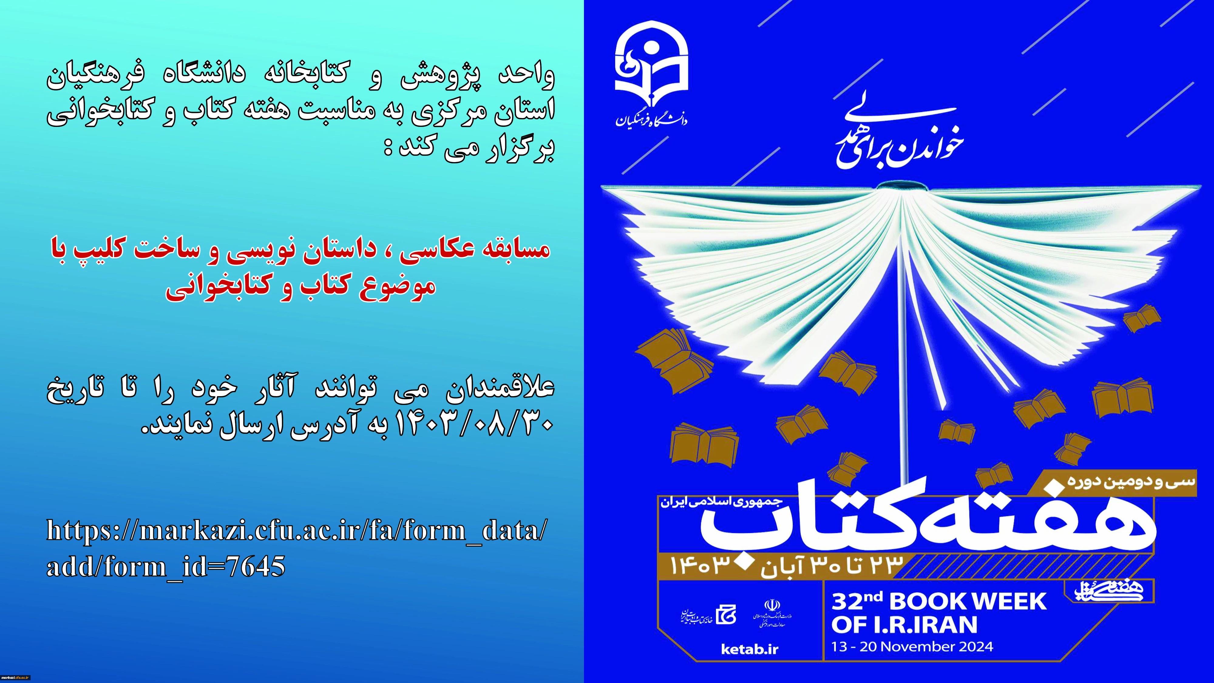 امتیاز دهید : مسابقه عکاسی ، داستان نویسی و ساخت کلیپ با موضوع کتاب و کتابخوانی 2 دوشنبه 21 آبان 1403 ساعت 10:20