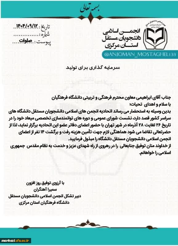 امتیاز دهید : پیام تبریک سرپرست دانشکده علوم تربیتی به مناسبت روز دانشجو 2 سهشنبه 18 آذر 1404 ساعت 13:15